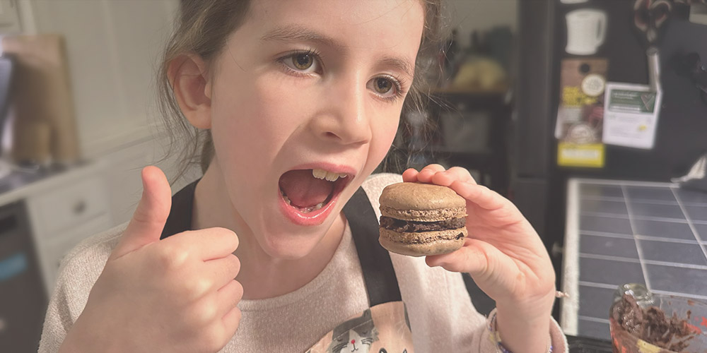 Beat the egg whites until fluffy, then beat in the granulated sugar until the mixture is glossy and you get floppy peaks. Put in the almond flour, powdered sugar, cocoa powder, and a few grains of salt. Fold the dry ingredients into the eggs until you get a mousse-like consistency