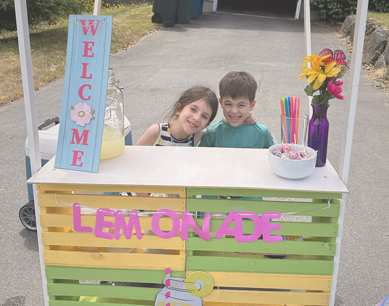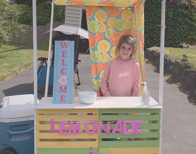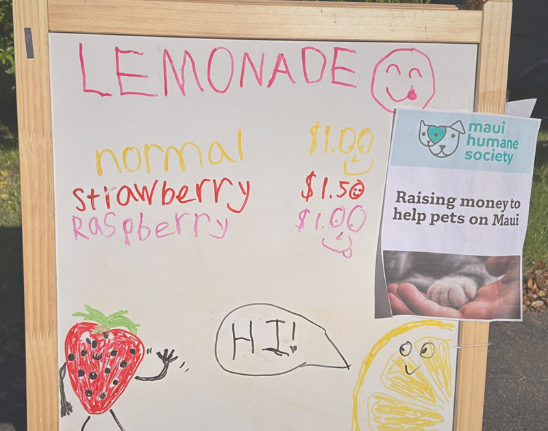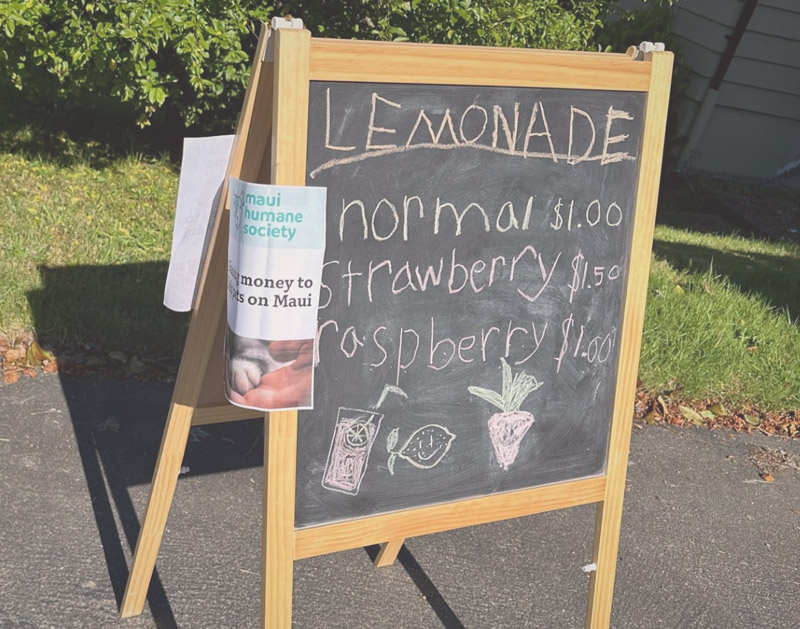 During the summer months, I enjoy selling lemonade from my mobile lemonade stand. The fresh strawberry puree upgrade is very popular, and every visitor receives a free lollipop! After the Hawaii Maui fires in 2023, I donated all profits to help Maui pets and animals in need.